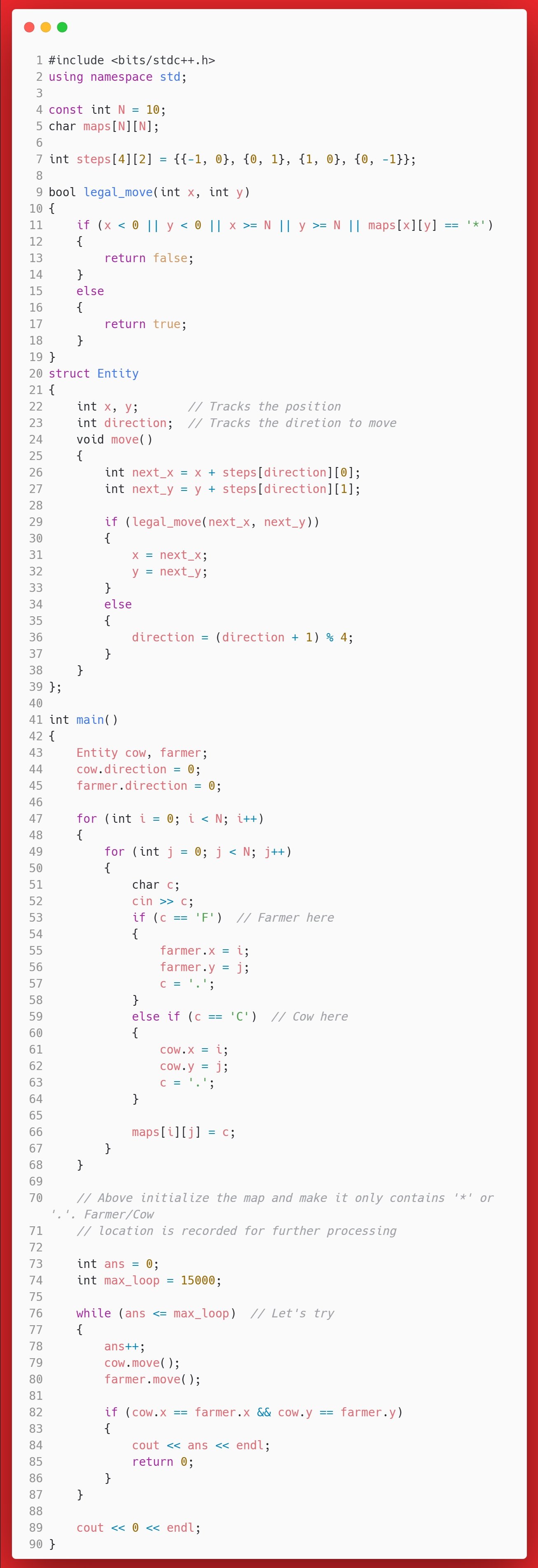 本题的核心是两个实体的同步移动与右转规则,会导致状态空间有限(位置×方向,共\((10×10×4)^2=160,000\)种组合),因此必然进入循环。设置 max_loop=15000 是经验做法,更稳妥的是用哈希或布尔数组记录状态 (cow.x,cow.y,cow.dir,farmer.x,farmer.y,farmer.dir),一旦重复即判定永不相遇。当然,本题中15000已经够好了,因为代码已经AC。