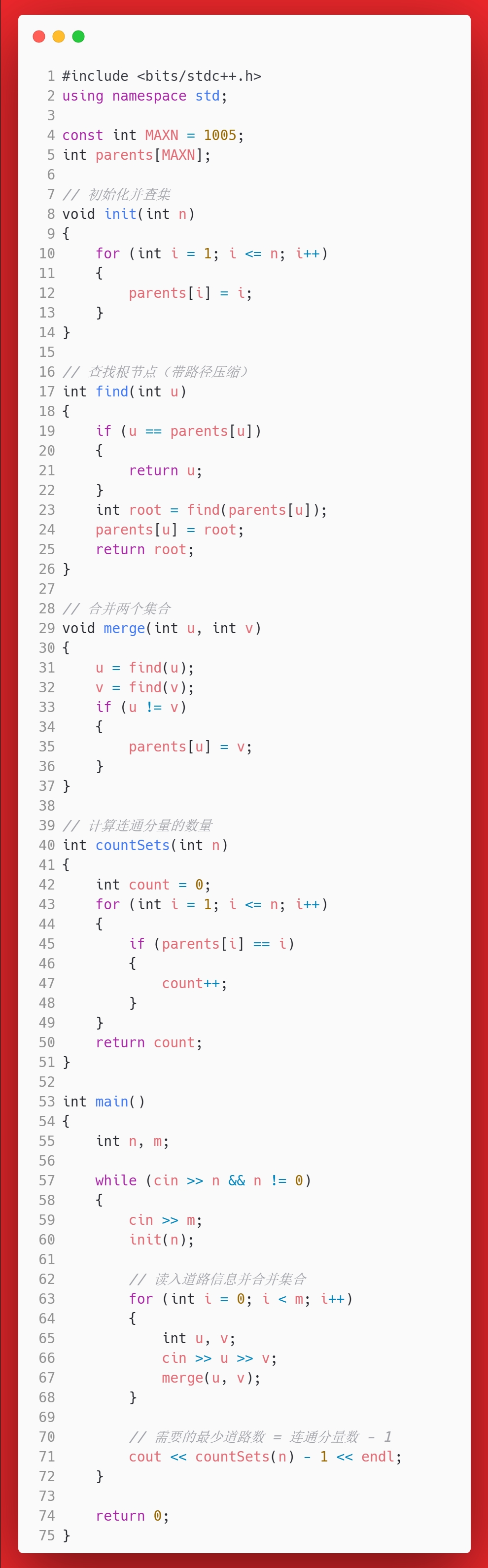 这一题可以在P1551:亲戚基础上进行。初始化、查找、合并等代码是一样的。但需要多一个函数来统计独立集合的个数——也就是相互间不存在“亲戚”关系的集合最终有几个,这个数字减1就是还要建立连通关系的数量。