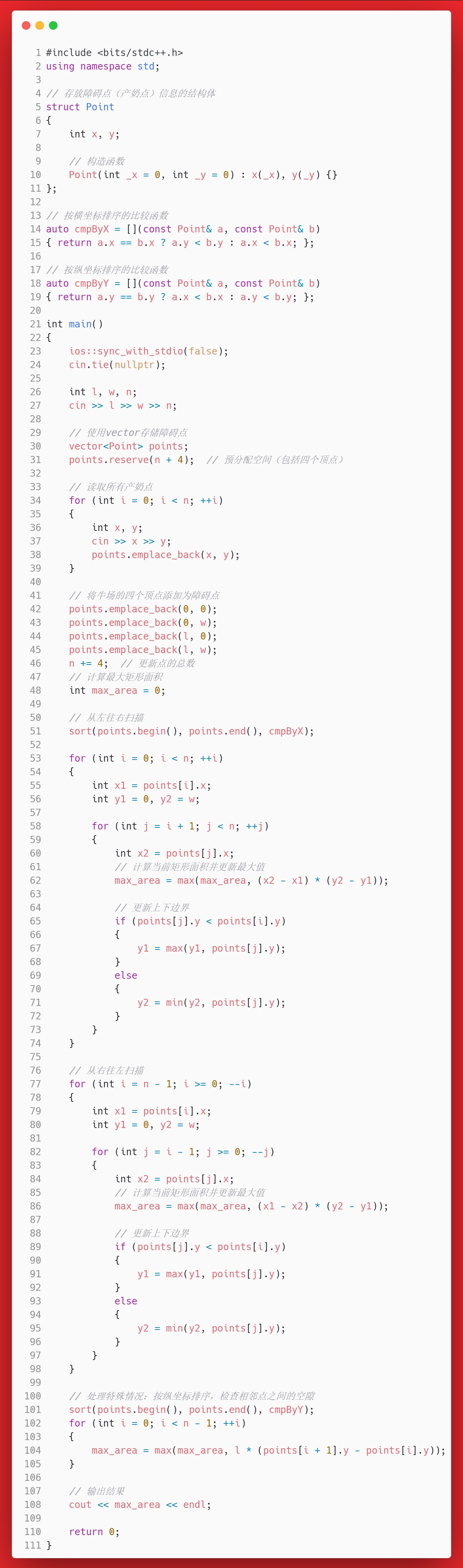 算法的时间复杂度是\(O(n^2)\),其中\(n\)是障碍点的数量。这比暴力枚举所有可能的矩形(\(O(n^4)\))要高效得多。