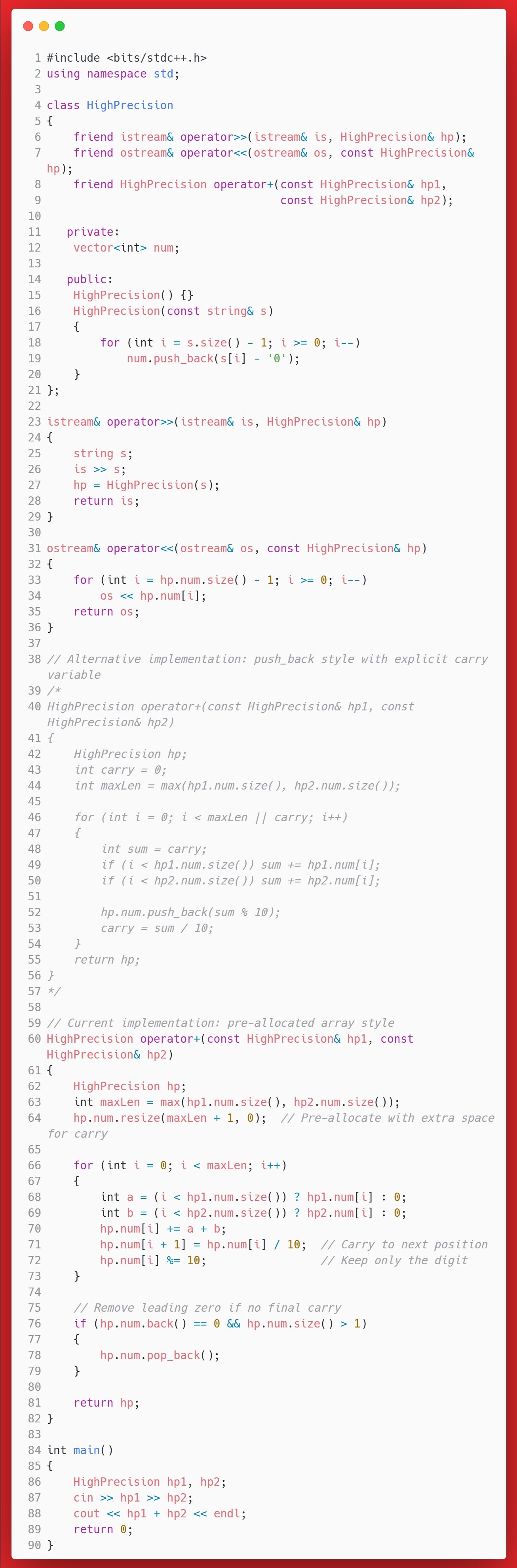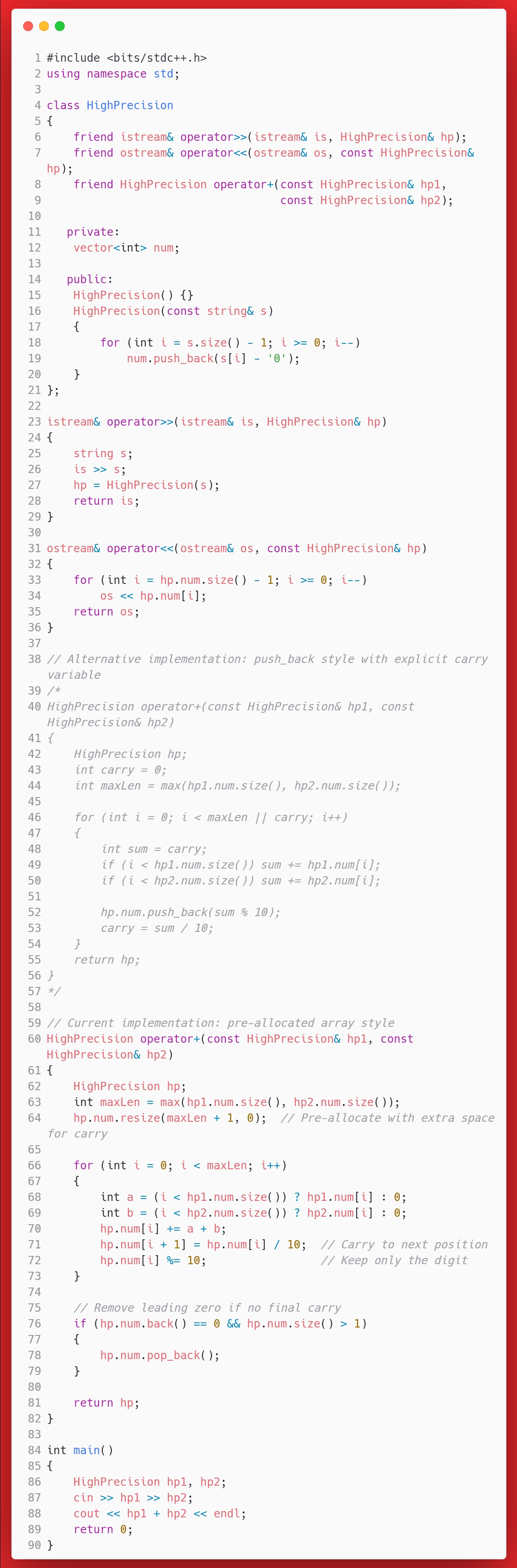 然后重载+运算,然后是用来存放各位数字的一个私有成员vector<int> num,并声明两个构造函数。请注意第二个构造函数HighPrecision(const string& s)的实现:它是把数字的位从低位到高位依次存放(也就是将字符串的末尾字符先放入 num[0])。之所以这样存放,是为了后续加法时可以从低位开始顺序遍历各个位数,便于处理进位。