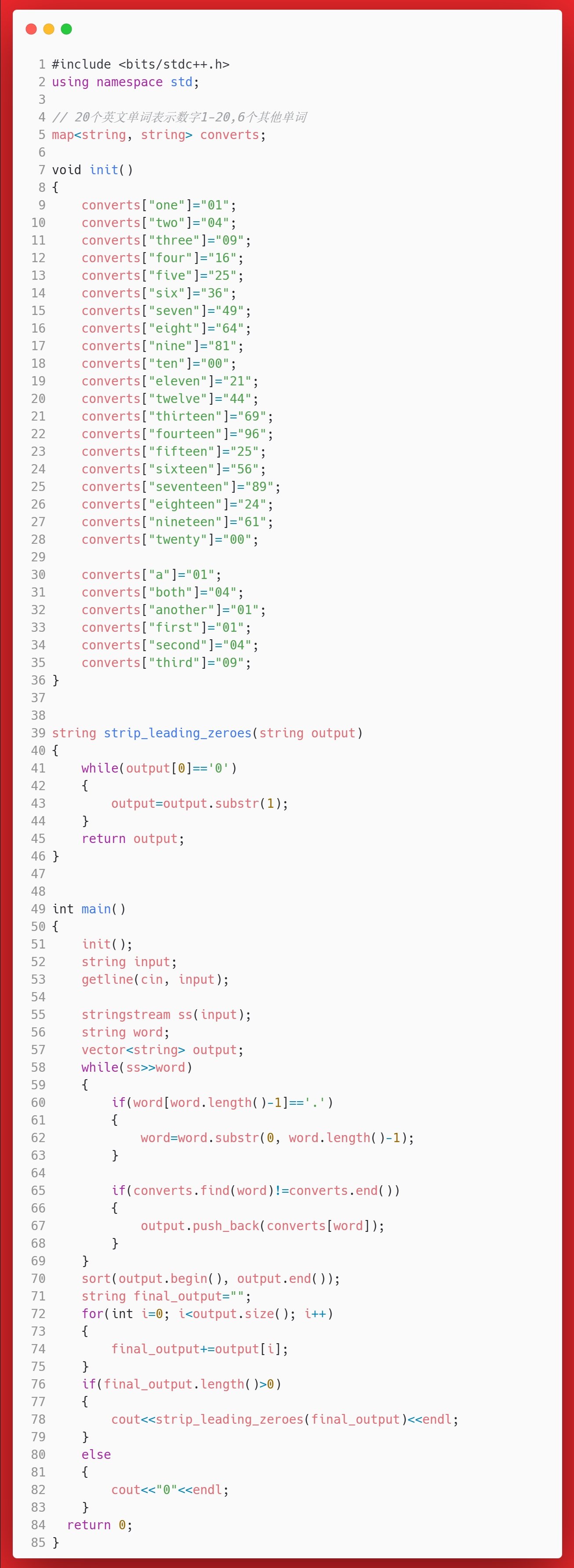 这里我们先处理最后一个单词带.的情况——这也是英文句子结尾的标记,在ss>>word的时候,这个.是会和单词一起读入的。如果一个单词结尾是.,我们将其去掉,然后在映射converts中找是不是有这个单词的key,如果有,就将它代表的两位数字放入output数组中。