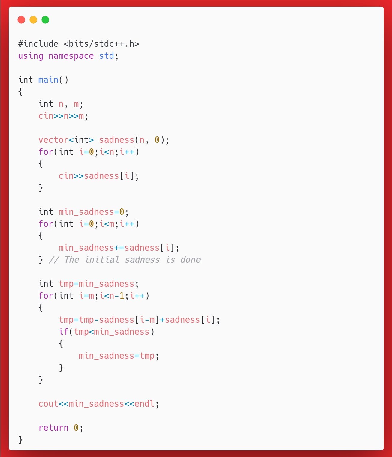 在区间长度m确定的情况下,我们只要用一次循环就可以找出所有长度为m的区间。而且可以观察到:每次窗口右移一格,就有一个数字退出、一个数字进入。所以,在求这个区间内的数字和时,不必再用循环求和,而是可以直接用之前的和减去一个再加上一个的方法。我们只要确定退出的数字的位置(i-m)和进入的数字的位置(i)即可。