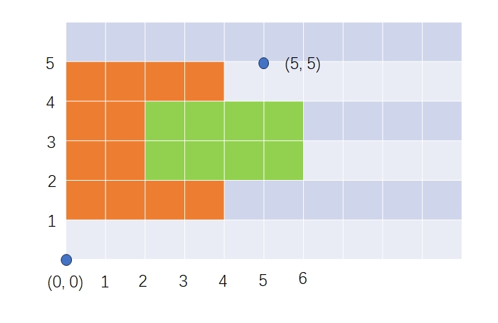 (0, 5) - (4, 1)(橙色)。面积16。部分会被第二个矩形遮盖(重合)。 - 第二个矩形坐标: