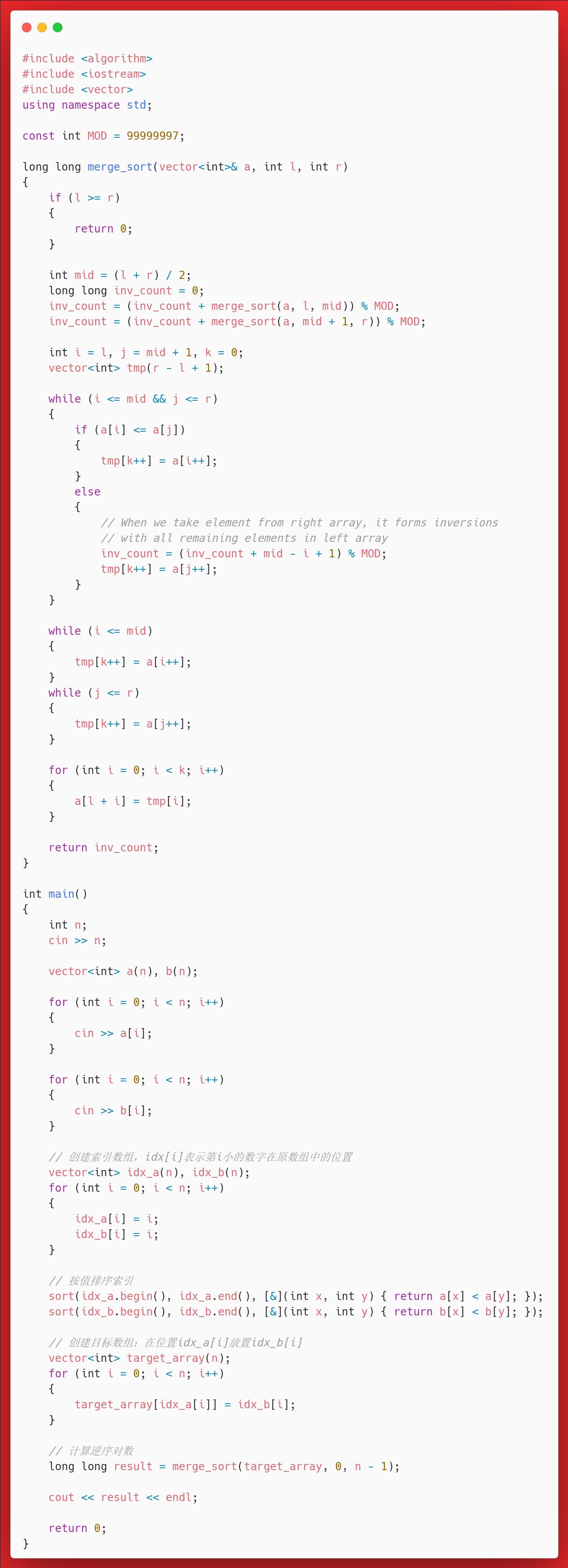最后,用我们熟悉的归并排序统计逆序对。对答案按题意取模,本题模数为99999997。