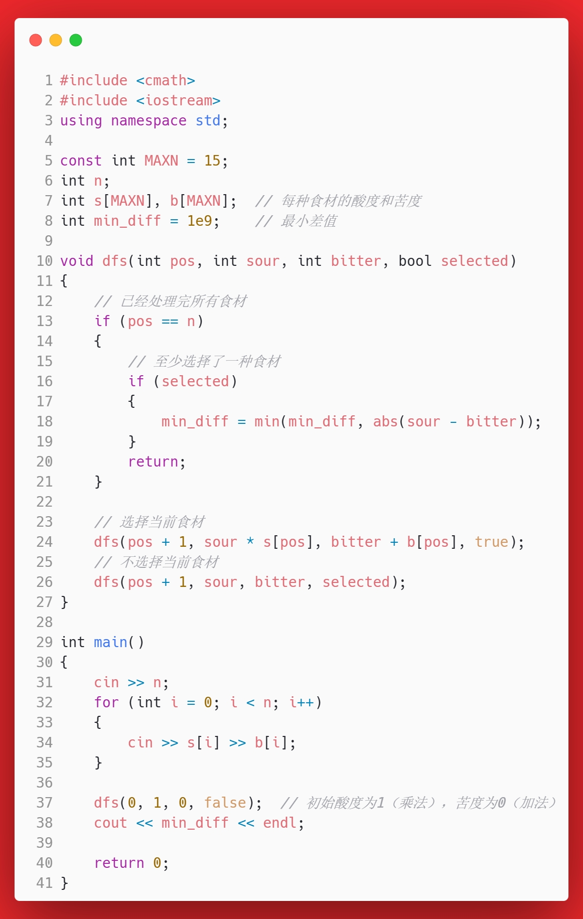 本题可以先用暴力解决,还是用到位掩码来遍历所有可能性。然后分别计算酸度(S)和苦度(B)。但在遍历所有可能的时候,需要排除选择0个配料的问题,所以就不是从0开始,而是从1开始: