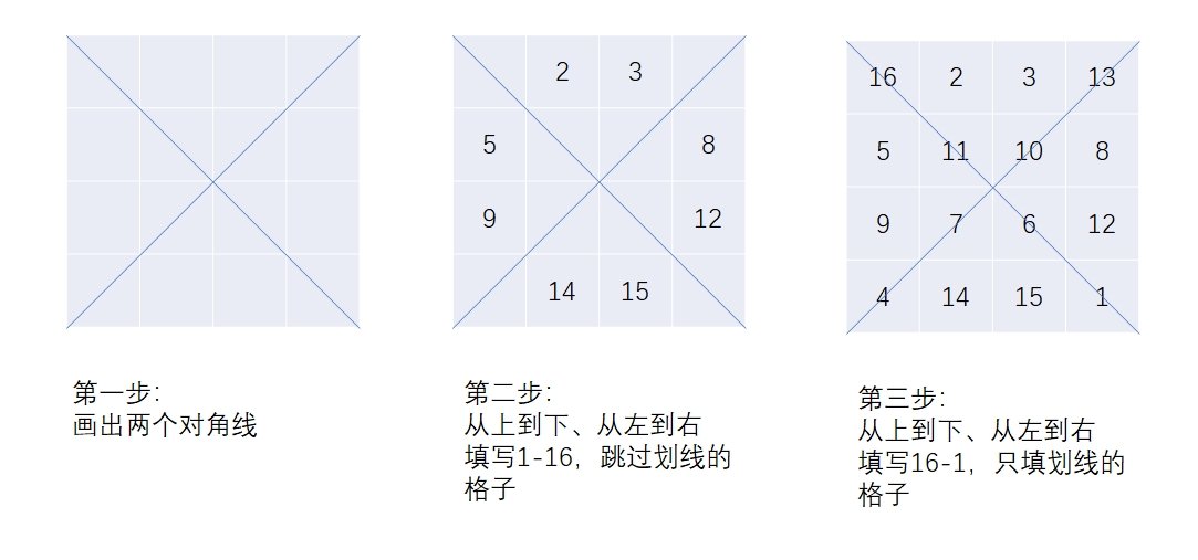 这题的解法只适用于奇数阶幻方。偶数阶幻方的解法是另外一种。以下我用4阶幻方做个演示: