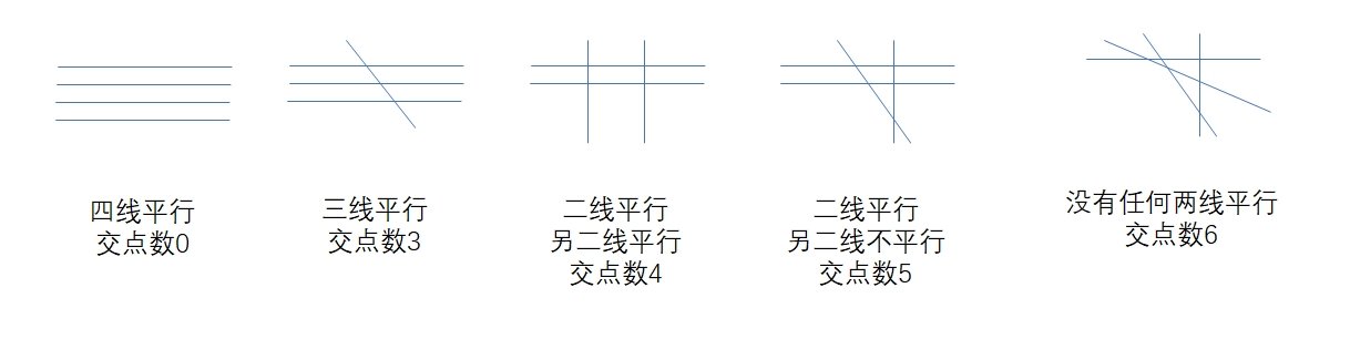 4条线为一组,剩下0条线,4*0=0,不产生交点(m=0)。所有直线处理完毕。3条线为一组,剩下1条线,3*1=3,增加了3个交点。所有直线处理完毕。2条线为一组,剩下2条线。2条线为一组(也就是上面剩下的这2条线时平行的),剩下0条线,2*2=4,增加了4个交点。所有直线处理完毕。- 上面剩下的
